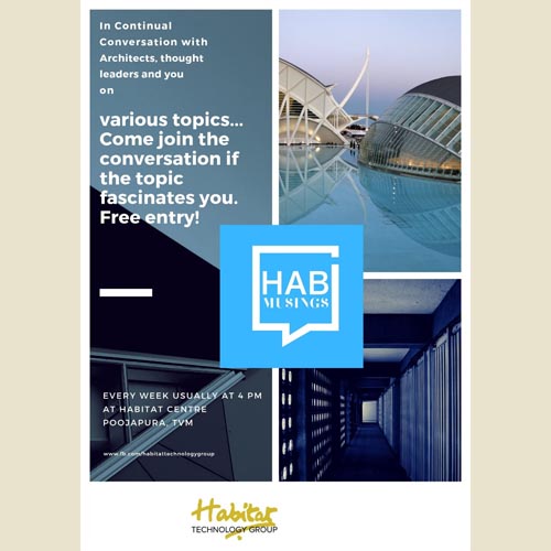 Hab Musings is a new series of weekly conversation sessions initiated by Habitat Technology Group. It is held mostly on Friday evening, at 4 o'clock, at Habitat Centre, Poojapura, TVM. Anyone who loves architecture is most welcome to join the sessions. The inaugural round was held on 28th June 2019.